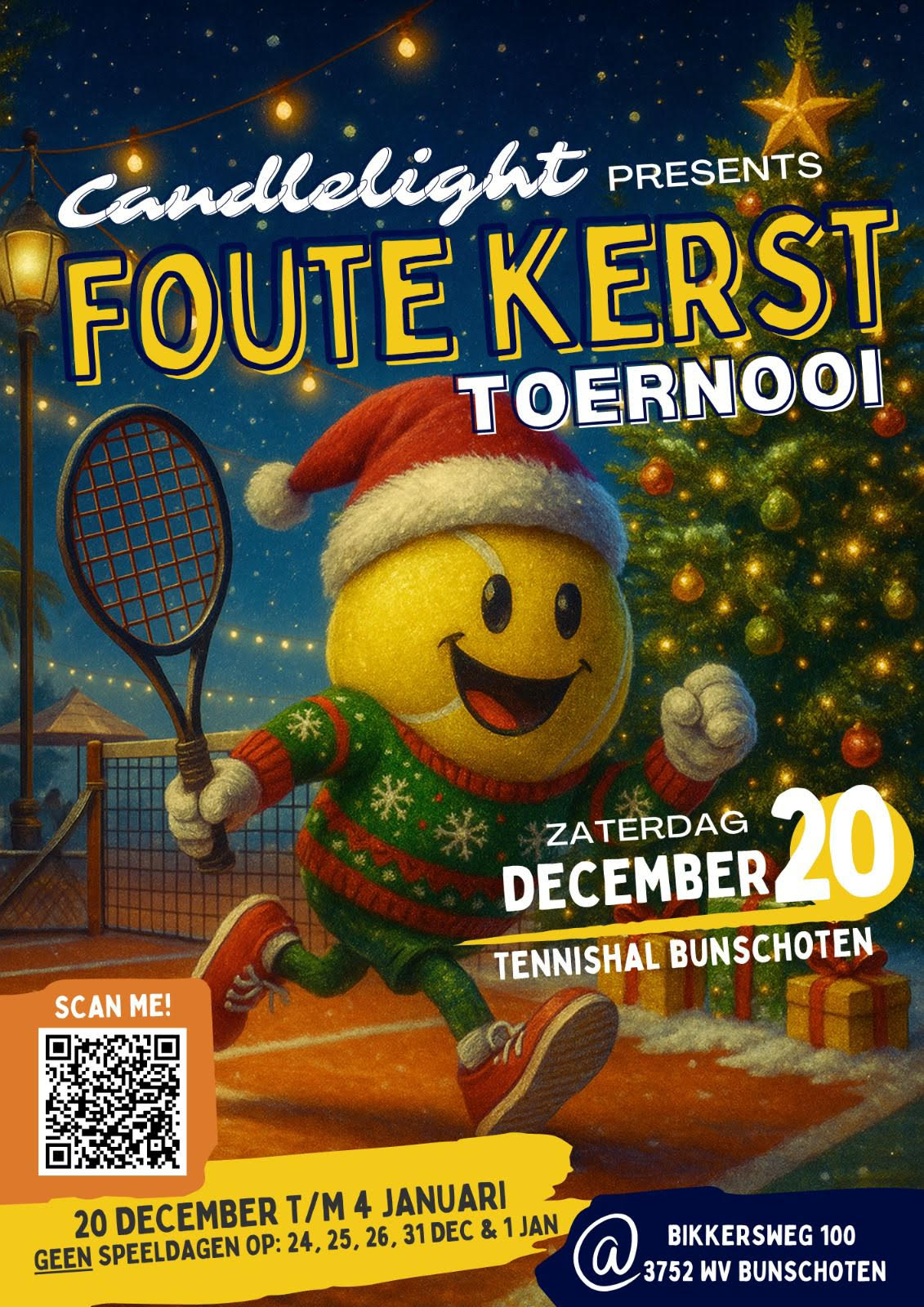 Vanaf 20 december start HET tennistoernooi van het jaar weer in Tennishal Bunschoten, het gezelligste toernooi in de kerstvakantie Candlelight open.